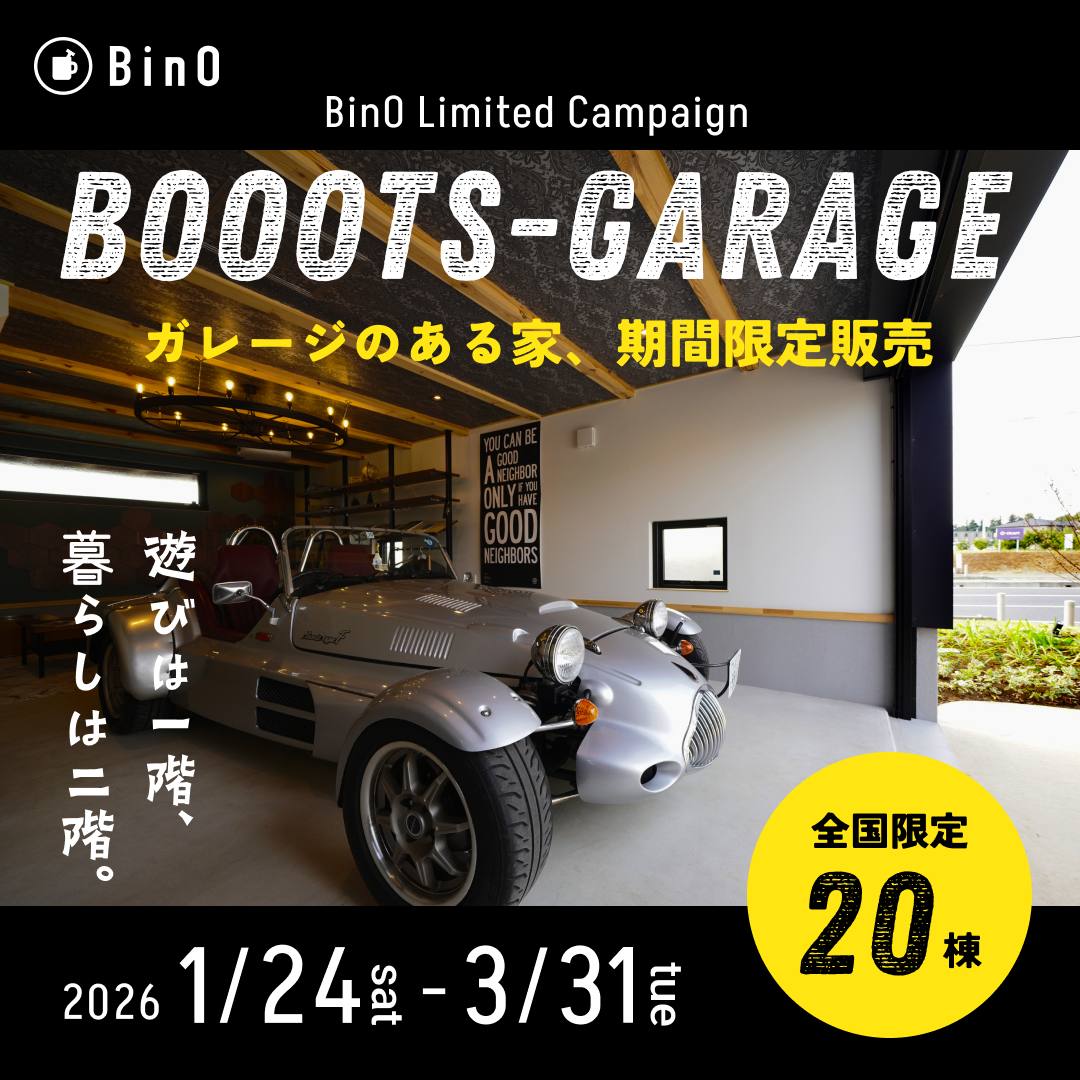BOOOTS-GARAGE 全国20棟限定 キャンペーン開催 2026.01.27 いまだけお得なキャンペーン開催中!2026年3月31日までのエントリーで、請負金額より100万円OFF!! 詳細はこちら